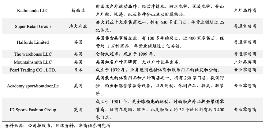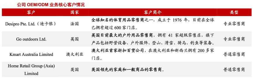 經(jīng)典案例:根據(jù)公司招股書、網(wǎng)絡(luò)資料、浙商證券研究所等綜合資訊表明,除了迪卡儂外,牧高笛其他核心客戶也均為全球優(yōu)質(zhì)的零售商或品牌商。縱觀牧高笛公司 30 多家 客戶,大致可分為三類:1)普通的綜合性零售商:如澳大利亞的 Kmart、Super Retail, 英國的 Home Retail等;2)專業(yè)戶外用品零售商:如英國最大的戶外零售商 Go outdoors、美國最大的體育戶外用品商店 Academy;3)戶外用品品牌商:如新西蘭的 Kathmandu、美國的Mountainsmith 等。