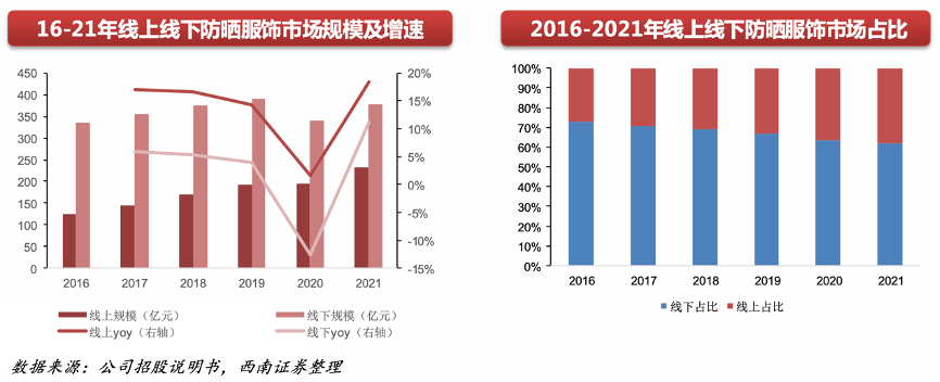 經(jīng)典案例:根據(jù)公司招股說明書、西南證券等綜合資訊表明,防曬服飾以線下市場(chǎng)為主,根據(jù)蕉下招股書,2021年線上/線下營(yíng)收分別達(dá)到232/378億元,近三年線上/線下渠道復(fù)合增速分別達(dá)11%/0.4%,線上快速增長(zhǎng)帶來渠道占比提升,2021年線上渠道占比達(dá)38%,較2016年提升11pp。