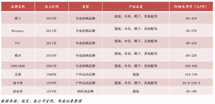 經(jīng)典案例:根據(jù)淘寶、各公司官網(wǎng)、西南證券等綜合資訊表明,我國(guó)防曬服飾的市場(chǎng)參與者包括戶外品牌的防曬系列、快時(shí)尚的防曬系列、專業(yè)防曬品牌三類,其中專業(yè)防曬品牌成立較晚但防曬品類更完善。蕉下作為國(guó)內(nèi)防曬服飾第一品牌,2021年在總零售額及線上零售額 中占比分別達(dá)到5%/12.9%。