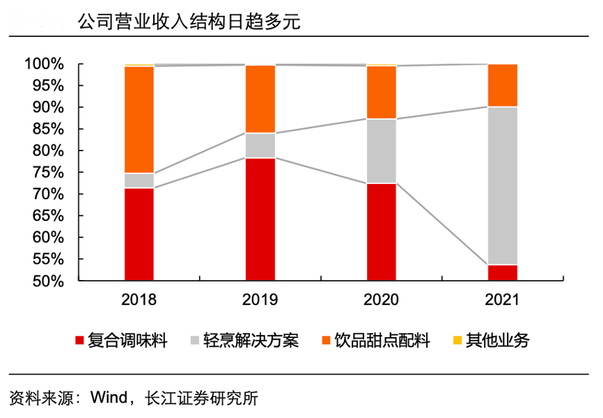 經典案例:根據wind、長江證券研究所等綜合資訊表明,2018年至2021年,寶立食品公司輕烹解決方案和飲品甜點配料營業(yè)收入占比從 28.18%提高至 46.29%,公司產品結構更加多元化。