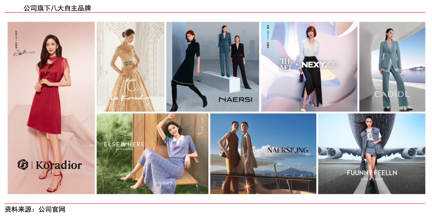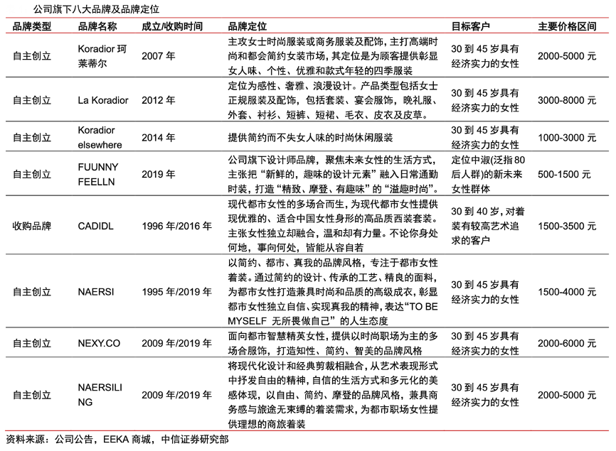 經(jīng)典案例:根據(jù)公司官網(wǎng)、中信證券研究部等綜合資訊表明,贏家時(shí)尚目前旗下共八大自主品牌,可分為高端線的 Koradior、La Koradior、Koradior elsewhere、NAERSI、NAERSILING、 NEXY.CO 、CADIDL,以及 2019 年新成立的中端品牌 FUUNNY FEELLN。八大品牌風(fēng)格定位及產(chǎn)品價(jià)格區(qū)間亦有差異:其中雙主品牌 Koradior 和NAERSI,以及收購品牌 NEXY.CO 、CADIDL 主要為都市女性提供商務(wù)或休閑服飾,主流產(chǎn)品價(jià)格區(qū)間位于2000 到 5000 元。