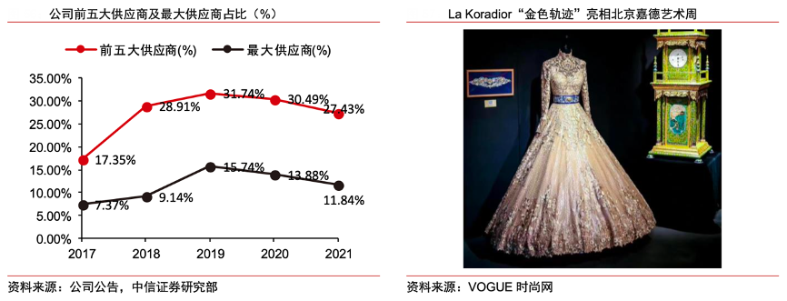 經(jīng)典案例:根據(jù)公司公告、VOGUE時(shí)尚網(wǎng)、中信證券研究部等綜合資訊表明,截至2021年贏家時(shí)尚公司前五大供應(yīng)商占 比 27.43%,最大供應(yīng)商占比 11.84%,2021 年公司旗下各大品牌均發(fā)布多款創(chuàng)意設(shè)計(jì),例如 Koradior 與意大利設(shè)計(jì)師洛倫佐·瑪利亞·維奇羅合作推出的的“法國(guó)玫瑰”系列、La Koradior 與國(guó)內(nèi)知名設(shè)計(jì)師彭晶聯(lián)名設(shè)計(jì)的“傳世臻藏”百萬(wàn)禮服“金色軌跡”。