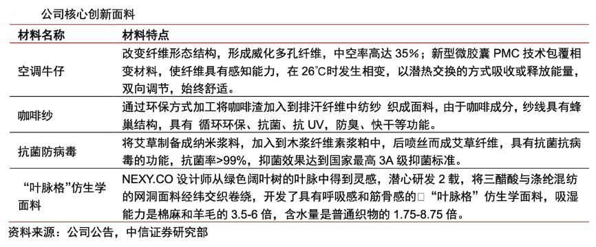 經(jīng)典案例:根據(jù)公司公告、中信證券研究部等綜合資訊表明,贏家時(shí)尚公司從功能及環(huán)保角度對(duì)面料進(jìn)行創(chuàng)新升級(jí),核心創(chuàng)新面料包括:空調(diào)牛仔、咖啡紗、抗菌防病毒、葉脈格仿生學(xué)面料。其中葉脈格仿生學(xué)面料為公司與面料商合作開(kāi)發(fā),將三醋酸與滌綸混紡的網(wǎng)洞面料經(jīng)緯交織卷繞,大幅提升吸濕力和含水量,為公司獨(dú)家使用。