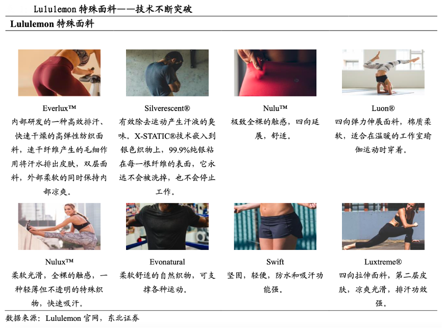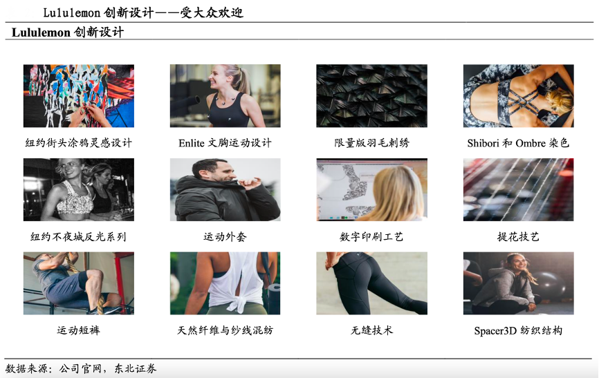 經(jīng)典案例:根據(jù)公司官網(wǎng)、東北證券等綜合資訊表明,Lululemon面料研發(fā)和時尚創(chuàng)新由研究人員、工程師和專業(yè)設(shè)計師團隊合作完成,體現(xiàn)“以健康生活方式為靈感”設(shè)計理念的同時保證高品質(zhì),團隊根據(jù)市場行情和客戶反饋確定趨勢,尋求在產(chǎn)品功能、風(fēng)格、技術(shù)上實現(xiàn)靈感突破。
