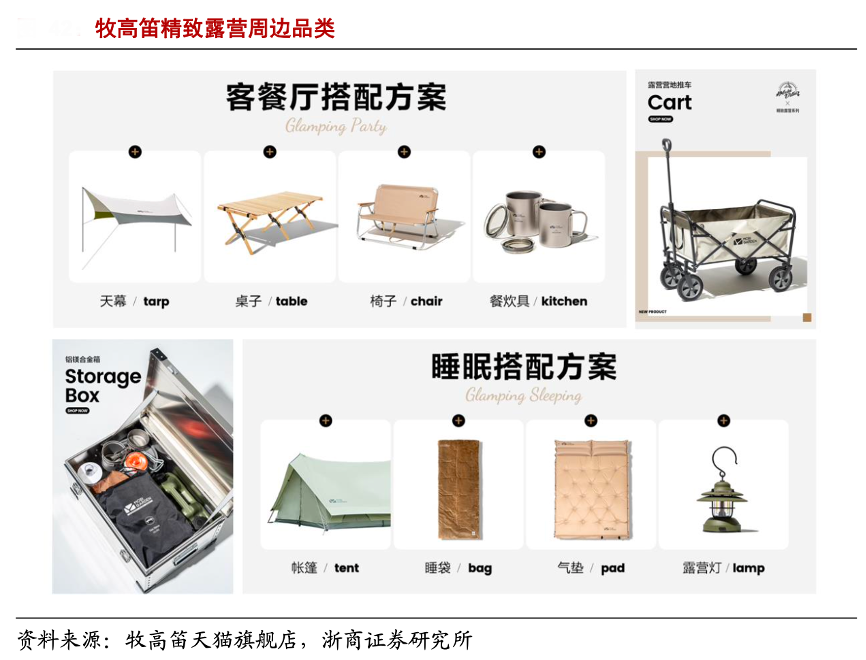 經(jīng)典案例:根據(jù)牧高笛天貓旗艦店、浙商證券研究所等綜合資訊表明,牧高笛公司圍繞精致露營(yíng),打造高海拔、精致徒步、精致露營(yíng)、精 致野餐場(chǎng)景矩陣,開(kāi)發(fā)睡眠系統(tǒng)、廚房系統(tǒng)、收納系統(tǒng)、客廳系統(tǒng)的產(chǎn)品矩陣,2021年大牧品牌中帳篷收入占比從 20 年的約 60%降至約 40%,SKU 由此前 200 款增至 400- 500 款。