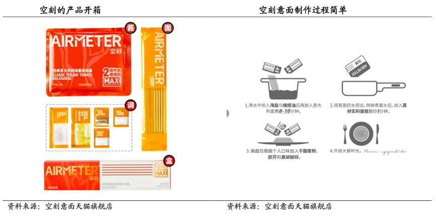 經(jīng)典案例:根據(jù)空刻意面天貓旗艦店、國海證券研究所等綜合資訊表明,一盒空刻意面的產(chǎn)品包括 6 個料包,分別是意面醬,海鹽,歐洲進口橄欖油,干 酪包,歐芹包與黑胡椒包。產(chǎn)品整體重量 270g,其中意面醬料包就達到150g。在制作方法上,只需要將意大利面水煮 8-10 份中,然后將翻炒過的意面醬和其他料包淋在意面上即可。制作過程非常簡單快捷。