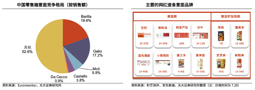 經(jīng)典案例:根據(jù)Euromonitor、町芒測評、京東商城、光大證券研究所等綜合資訊表明,從競爭格局來看,西式意面行業(yè)當前缺乏大規(guī)模企業(yè)。意面賽道內(nèi)的主要競爭者主要分為兩類,一類是傳統(tǒng)意面企業(yè),一類是新興網(wǎng)紅速食意面企業(yè)。2021年,傳統(tǒng)意面企業(yè)中規(guī)模最大的 Brilla 和 Gallo 零售端約為 1.7 億元和 1.5 億元,規(guī)模較?。恍屡d網(wǎng)紅速食意面企業(yè)大多處于初始成長期,同樣規(guī)模較小。當前的競爭環(huán)境給予對空刻這樣的新品牌較好的生存空間。