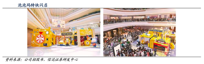 經(jīng)典案例:根據(jù)公司招股書、信達證券研發(fā)中心等綜合資訊表明,泡泡瑪特公司通過與購物中心合作,推出限時主題的快閃店,快閃店形式多樣化且一般位于商場較為顯眼位置,創(chuàng)造浸入式的購物體驗并且提升品牌知名度??扉W店的期限一般為 1~3 個月。