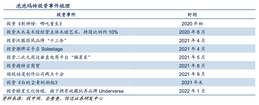 經(jīng)典案例:根據(jù)投中網(wǎng)、企查查、信達證券研發(fā)中心等綜合資訊表明,泡泡瑪特公司對動漫、國風潮牌、潮玩品牌等領(lǐng)域投資,在參投兩部優(yōu)秀國內(nèi)動漫電影《新神榜:哪吒重生》、《白蛇 2: 青蛇劫起》后,公司推出了相應IP 的潮玩盲盒。21 年 4 月、22 年 1 月,公司分別投資潮 牌買手店 Solestage、暗星文化傳媒(旗下?lián)碛惺詹赝婢咂放?nbsp;Underverse),產(chǎn)生業(yè)務(wù)戰(zhàn)略聯(lián)動。