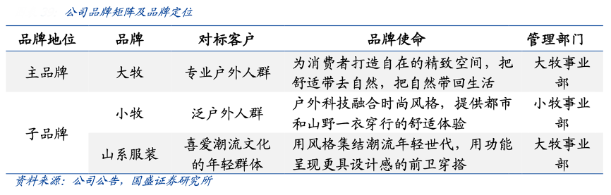 經(jīng)典案例:根據(jù)公司公告、國盛證券研究所等綜合資訊表明,2021年,牧高笛公司對品牌理念進行進一步升級,形成了以“大牧”(Mobi Garden)為主品牌,“小牧”(Mobi Garden Urban)與“山系服裝”(MOBI VILLA)為子品牌的品牌矩,并明確品牌風(fēng)格和對標(biāo)客戶,即“大牧”品牌主要提供戶外專業(yè)裝備及服裝,“小牧”品牌主要提供多場景穿著。