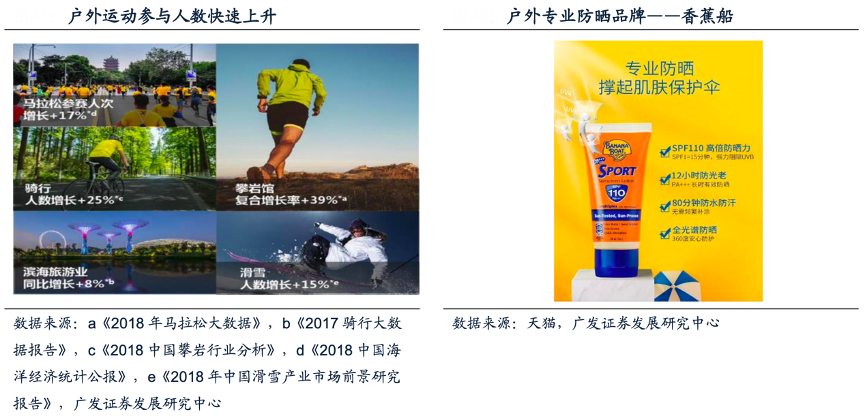 經(jīng)典案例:根據(jù)《2018年馬拉松大數(shù)據(jù)》、《2017騎行大數(shù)據(jù)報告》、《2018中國攀巖行業(yè)分析》、《2018中國海洋經(jīng)濟統(tǒng)計公報》、《2018年中國滑雪產(chǎn)業(yè)市場前景研究報告》、天貓、廣發(fā)證券發(fā)展研究中心等綜合資訊表明,隨著國人的健康意識不斷加深,戶外運動的參與人數(shù)快速上升。其中,馬拉松、騎行為代表的公路場景和濱海旅游為代表的海邊場景,對防曬產(chǎn)品提出更專業(yè)的要求。香蕉船(Banana Boat)就是戶外專業(yè)防曬的代表,其推出的運動防曬霜SPF110 憑借著高倍的防護能力廣受好評。在天貓旗艦店的評論區(qū),大部分購買者的購買原因為三亞等海邊旅行。