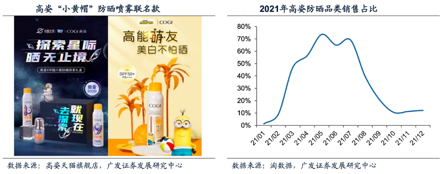 經(jīng)典案例:根據(jù)淘數(shù)據(jù)、高姿天貓旗艦店、廣發(fā)證券發(fā)展研究中心等綜合資訊表明,憑借高性價比,防曬品類已經(jīng)發(fā)展成為高姿的品牌支柱。淘數(shù)據(jù)顯示,2021全年高姿官方旗艦店防曬品類銷售額高達2.15億元,銷售占比49.52%。防曬銷售高峰5-7月,防曬品類銷售占比高達73.64%、64.98%和68.98%。高姿乘上防曬市場高速發(fā)展之東風,以防曬先行的打法,走出了老牌國貨的應變之路。