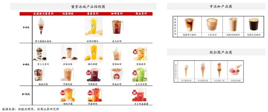 經(jīng)典案例:根據(jù)招股說明書、浙商證券研究所等綜合資訊表明,蜜雪冰城的主打單品均在6元以下。公司始終堅持“高質(zhì)平價”的產(chǎn)品定位,門店產(chǎn)品價格主要集中在6至8元區(qū)間內(nèi),遠低于市場主要競爭對手,持續(xù)吸引越來越多的消費者購買公司產(chǎn)品。同時,“高質(zhì)平價”的產(chǎn)品定位,為公司門店在三四線城市持續(xù)、快速發(fā)展,提供了龐大的消費群體基數(shù)。