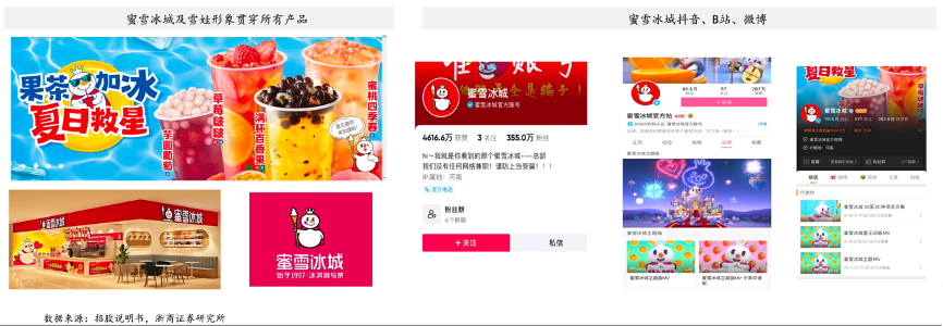 經(jīng)典案例:根據(jù)招股說明書、浙商證券研究所等綜合資訊表明,蜜雪冰城線上品牌營銷+自有IP+主題曲同步發(fā)力,形成廣泛粉絲認知,目前“雪王”相關視頻播放量超過 10 億次、“蜜雪冰城”主題曲播放量超過 40 億次。公司通過線上營銷不斷擴大公司品牌在全國范圍內(nèi)的知名度及影響力,其微信公眾號、抖音、快手、微博等平臺粉絲量總計約三千萬。