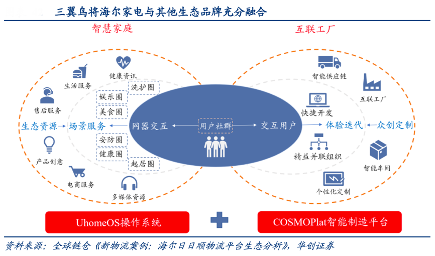 經(jīng)典案例:根據(jù)全球鏈倉《新物流案例:海爾日日順物流平臺生態(tài)分析》、華創(chuàng)證券等綜合資訊表明,三翼鳥生態(tài)以海爾家電為基礎(chǔ)不斷延伸拓展,將海爾各類家電產(chǎn)品與其他生態(tài)品牌充分融合,借助卡奧斯平臺賦能提高生產(chǎn)供應(yīng)商效率,UhomeOS系統(tǒng)為智慧家庭提供操作接口,高端品牌卡薩帝提供套系產(chǎn)品,最終通過日日順物流的高效送裝實現(xiàn)場景生態(tài)落地。