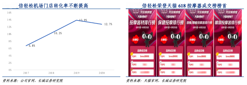 經(jīng)典案例:根據(jù)公司官網(wǎng)、天貓官網(wǎng)、長(zhǎng)城證券研究院等綜合資訊表明,在簽約肖戰(zhàn)后的天貓 618 節(jié)促活動(dòng)中,倍輕松公司多款產(chǎn)品銷(xiāo)量榮登同類目銷(xiāo)量榜榜首。同時(shí),2017-2020年,公司機(jī)場(chǎng)門(mén)店的客流轉(zhuǎn)化率持續(xù)提高,從6.8%提升至12.7%,增幅約為 5.9 個(gè)百分點(diǎn)。