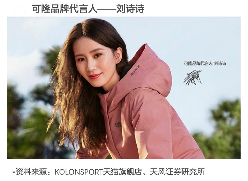 經(jīng)典案例:根據(jù)KOLONSPORT天貓旗艦店、天風(fēng)證券研究所等綜合資訊表明,女性用戶更容易上手輕戶外覆蓋的旅行、徒步、登山、露營、釣魚、打獵等休閑戶外運(yùn)動,可隆也擁有著比其他戶外品牌更高的女性消費(fèi)群體占比,其選擇了“劉詩詩”為品牌代言人。