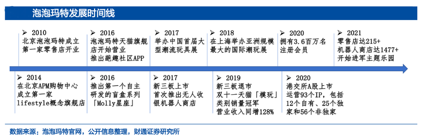 經(jīng)典案例:根據(jù)泡泡瑪特官網(wǎng)、公開信息整理、財(cái)通證券研究所等綜合資訊表明,截至2021年末,泡泡瑪特公司設(shè)置葩趣用以孵化與泡泡瑪特風(fēng)格差異較大的潛力 IP,并設(shè)立藝術(shù)推廣機(jī)構(gòu) inner flow 打造高端藝術(shù)衍生品;渠道端公司線下門店數(shù)量已達(dá)到 288 家,擁有 1861 臺機(jī)器人商店,線上端已連續(xù)三年取得天貓雙十一玩具類目銷售額第一名。