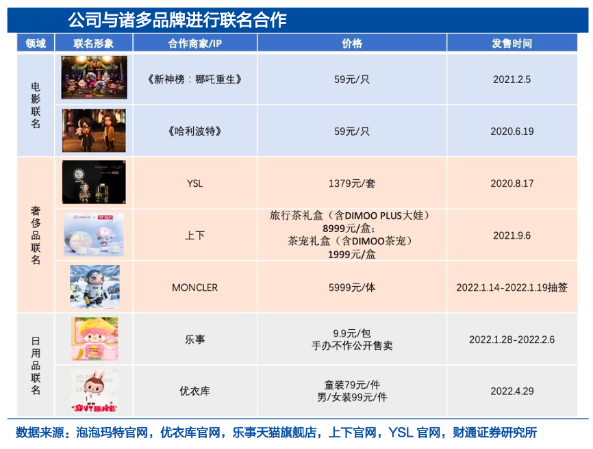經(jīng)典案例:根據(jù)泡泡瑪特官網(wǎng)、優(yōu)衣庫官網(wǎng)、樂事天貓旗艦店、上下官網(wǎng)、YSL官網(wǎng)、財(cái)通證券研究所等綜合資訊表明,泡泡瑪特不斷通過將 IP 與實(shí)體消費(fèi)品聯(lián)名結(jié)合,將自身 IP 融入大眾消費(fèi),進(jìn)一步增強(qiáng) IP 的曝光與破圈。以“SKULLPANDA”與“DIMOO”為例,“SKULLPANDA”與 LV 旗下美妝品牌“MAKE UP FOREVER”達(dá)成合作共同推出聯(lián)名款玩偶,嘗試時(shí)裝走秀,并聯(lián)合高校舉辦“SKULLPANDA”仿妝大賽。