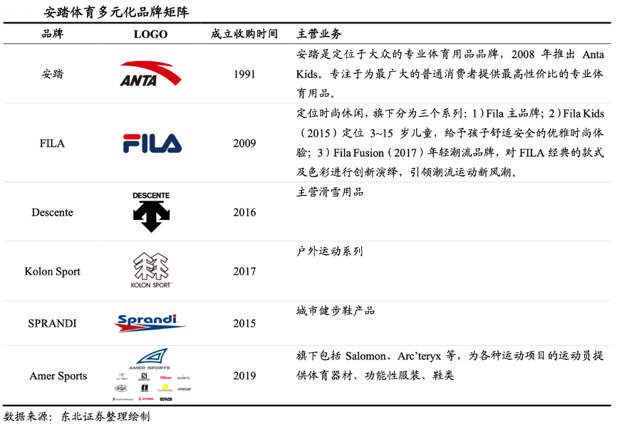 經(jīng)典案例:根據(jù)公司官網(wǎng)、東北證券等綜合資訊表明,安踏“多品牌”戰(zhàn)略布局。其中專業(yè)運(yùn)動品牌群包括安踏、安踏兒童、 SPRANDI;時尚運(yùn)動品牌群包括 FILA、FILA FUSION、FILA KIDS;戶外運(yùn)動品牌群包括 Descente、Kolon、Amer Sports 等。安踏體育全方位的覆蓋運(yùn)動服飾的細(xì)分領(lǐng)域、不同年齡的消費(fèi)者,并且針對不同消費(fèi)能力的群體,產(chǎn)品市場定位形成差異化布局。