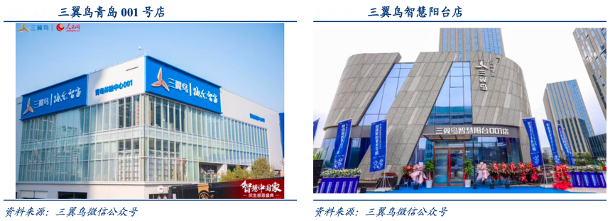 經(jīng)典案例:根據(jù)三翼鳥微信公眾號、華創(chuàng)證券等綜合資訊表明,三翼鳥001號店是首個物聯(lián)網(wǎng)全屋智慧家庭體驗(yàn)中心,內(nèi)部空間較大,涵蓋陽臺、廚房、客廳、浴室、臥室等多個場景,能夠承接全屋定制場景需求。001號店作為三翼鳥場景 品牌的標(biāo)志性門店,不僅能夠?yàn)橛脩籼峁┤菁译姾椭腔奂彝鼍敖鉀Q方案,同時 還包含設(shè)計、安裝、改造等一站式全流程服務(wù),有效帶動海爾生態(tài)場景銷售。