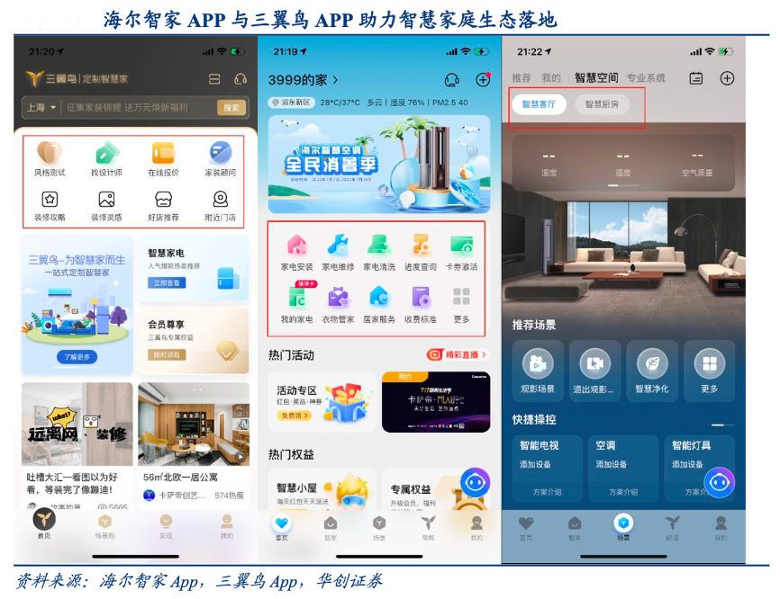 經(jīng)典案例:根據(jù)海爾智家APP、三翼鳥APP、華創(chuàng)證券等綜合資訊表明,海爾公司先后推出海爾智家App與三翼鳥App,用戶可通過線上服務(wù)管家對接需求,在實(shí)體店體驗(yàn)后可通過 App 直接下單,實(shí)現(xiàn)線上線下銷售一體化;場景落地后亦可在 App 上操控全屋不同產(chǎn)品的智慧功能,以及預(yù)約清洗、維修等全流程服務(wù)。