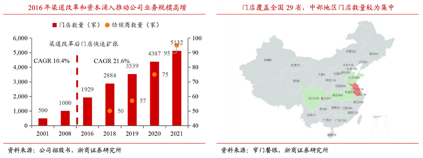 經(jīng)典案例:根據(jù)公司招股書、窄門餐眼、長(zhǎng)城證券研究院等綜合資訊表明,截至 2022 年 9 月,紫燕食品公司現(xiàn)有門店總數(shù)為 6030 家。2016 年公司改革加盟模式,由“直接管理加盟”調(diào)整為“公司-一級(jí)經(jīng)銷商-二級(jí)加盟商”兩級(jí)模式,降低新門店開發(fā)時(shí)間及成本不確定性、渠道管理難度。2018-2021 年門店數(shù)量 CAGR 達(dá)到 22%,江蘇、上海、安徽、湖北、四川、山東等六大鹵味重點(diǎn)省份門店數(shù)量占總門店的65%。