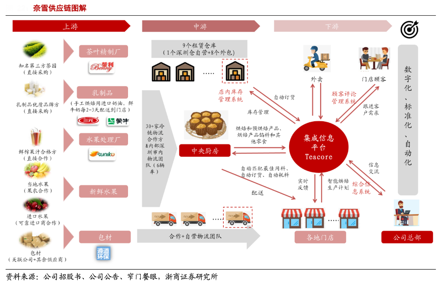 經(jīng)典案例:根據(jù)公司招股書、公司公告、窄門餐眼、浙商證券研究所等綜合資訊表明,在下游方面,奈雪通過自研供應(yīng)鏈和數(shù)字運營系統(tǒng)實現(xiàn)從供應(yīng)商到倉、運、配、生產(chǎn)等全環(huán)節(jié)標準化,開展數(shù)字化門店管理,實現(xiàn)原材料自動訂貨補貨、員工自動排班、優(yōu)化操作動線設(shè)計、優(yōu)化茶飲制作標準流程等精細化運營措施,大大降低操作難度和運營成本。
