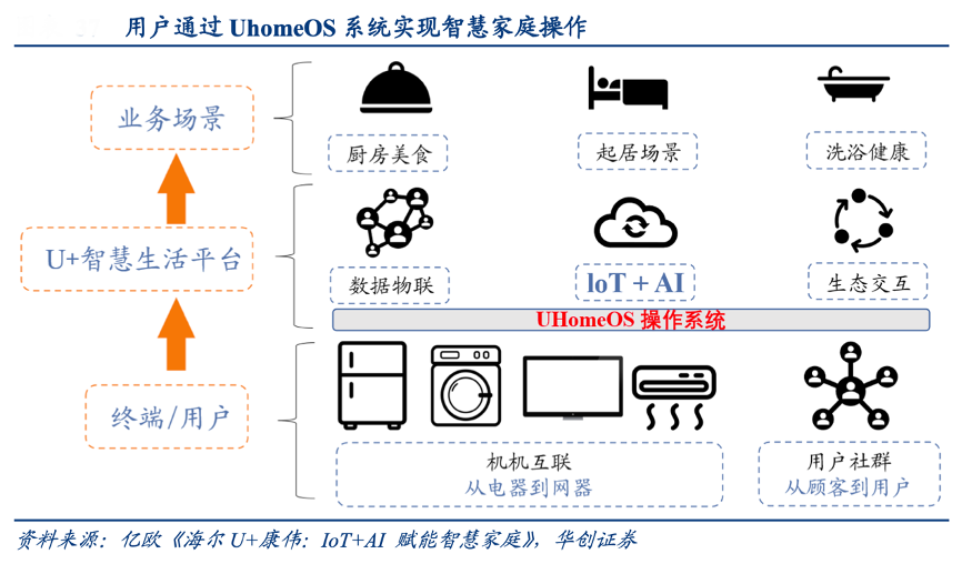 經典案例:根據(jù)億歐《海爾U+康偉:IOT+AI賦能智慧家庭》、華創(chuàng)證券等綜合資訊表明,UhomeOS 發(fā)布于2016 年,是海爾專為智慧家庭定制的生態(tài)操作系統(tǒng), 涵蓋臥室起居、廚房美食、浴室洗護等多個場景,可以通過 UhomeOS 系統(tǒng)把用戶、家電、服務三者串聯(lián)起來,提供全屋智能落地方案。