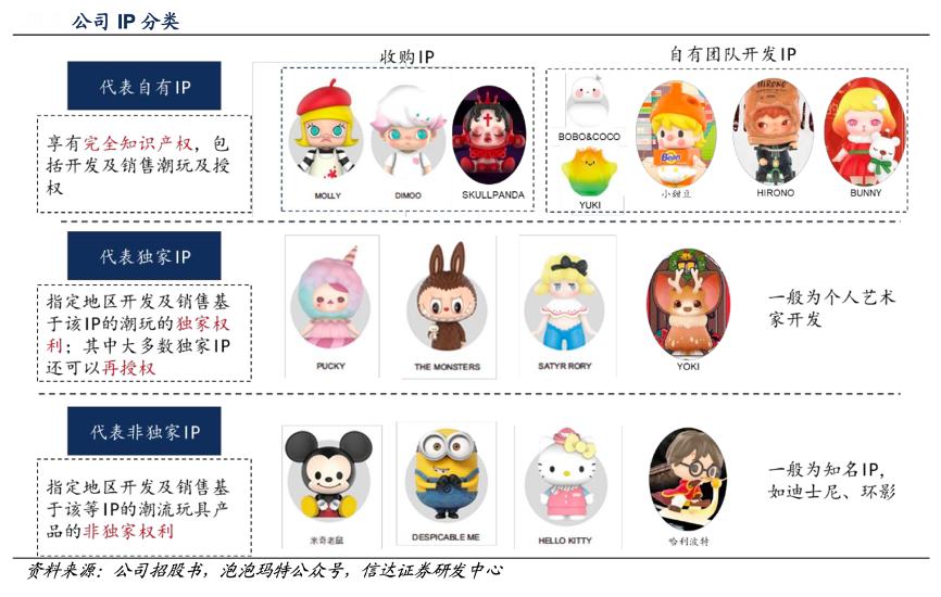 經(jīng)典案例:根據(jù)公司招股書、泡泡瑪特公眾號、信達(dá)證券研發(fā)中心等綜合資訊表明,截至 2020 年 6 月末,泡泡瑪特公司運營 IP 共計 93 個,包括 12 個自有 IP、25 個獨家 IP 和 56 個非獨家 IP。自有 IP 享有完全知識產(chǎn)權(quán),即開發(fā)、銷售潮流玩具及授權(quán)來獲得變現(xiàn)機(jī)會的權(quán)利,包括 (1)內(nèi)部設(shè)計師團(tuán)隊 PDC (Pop Design Center)創(chuàng)作IP,如 Yuki、BOBO&COCO、小甜 豆、Hirono、Bunny 等;(2)收購的代表性IP,如 Molly、Dimmo、SKULLPANDA 等。