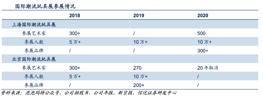經(jīng)典案例:根據(jù)公司招股書、泡泡瑪特公眾號、公司年報、新京報、信達(dá)證券研發(fā)中心等綜合資訊表明,泡泡瑪特公司每年于北京、上海定期舉辦兩次國際潮流玩具展 (PTS),邀請數(shù)百名藝術(shù)家?guī)頂?shù)百款作品與粉絲見面,并借此發(fā)現(xiàn)新藝術(shù)家。按參觀人次計,北京國際潮玩展和上海國際潮玩展已成為中國最大的潮流玩具展,有助于公司吸引更多優(yōu)質(zhì)人才。2020年上海國際潮流玩具展吸引了 500 名藝術(shù)家參展,參展品牌突破 300 個, 參展人次超過 10 萬