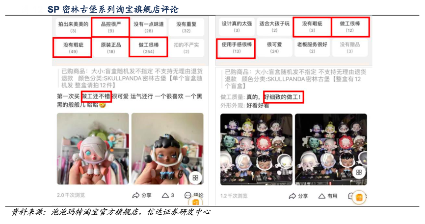 經(jīng)典案例:根據(jù)泡泡瑪特淘寶官方旗艦店、信達證券研發(fā)中心等綜合資訊表明,泡泡瑪特產(chǎn)品由專門生產(chǎn)玩具的第三方制造商制造。截至 2020 年 12 月,公司與 18 家第三方制造商合作,負責(zé)制定標準營運程序及設(shè)計產(chǎn)品原型和模具,審慎甄選供應(yīng)商并測試制造商生產(chǎn)的產(chǎn)品以確保產(chǎn)品質(zhì)量。在公司淘寶官方旗艦店評論頁面發(fā)現(xiàn),評論關(guān)鍵詞“品控很嚴”、“做工很棒”為較高頻詞匯,消費者對于產(chǎn)品質(zhì)量較為滿意。