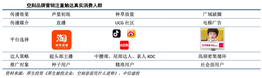 經(jīng)典案例:根據(jù)厚生投資《厚生被投企業(yè):空刻意面憑什么逆勢(shì)》、中信建投等綜合資訊表明,空刻通過(guò)梯媒進(jìn)一步靠近用戶(hù)消費(fèi)場(chǎng)景,傳遞“星級(jí)意面在家做”的品牌認(rèn)知,不斷觸達(dá)和覆蓋真實(shí)消費(fèi)人群。