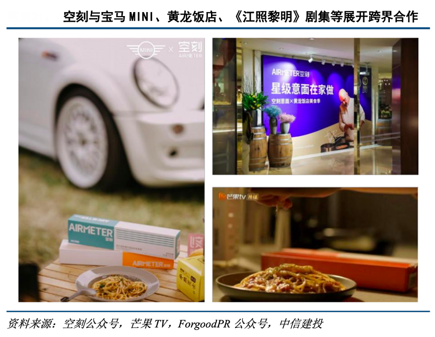 經(jīng)典案例:根據(jù)空刻公眾號、芒果TV、ForgoodPR公眾號、中信建投等綜合資訊表明,品牌聯(lián)名合作方面,空刻更為關(guān)注用戶重疊度,同寶馬 mini、 黃龍飯店、雀巢、劇集《江照黎明》等合作,滲入年輕白領(lǐng)、精致寶媽、中產(chǎn)階級等目標(biāo)群體的日常生活,推動品牌從“網(wǎng)紅”向“長紅”。