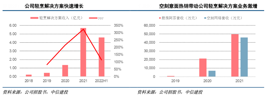 經(jīng)典案例:根據(jù)公司招股書、中信建投等綜合資訊表明,2019 年 11 月,廚房阿芬與寶立食 品合作開發(fā)新品氫刻意面(后更名為空刻意面),首創(chuàng)國內(nèi)速食意面新品類,連續(xù)三年蟬聯(lián)天貓銷售榜首。公司 2020 年輕烹解決方案同比增長 215.26%,主要來自空刻意面 2020 年的銷量大漲,彼時公司已為空刻意面供應(yīng)輕烹料 理醬包、歐芹撒粉和蒜香油包等輕烹解決方案產(chǎn)品;2021年輕烹解決方案業(yè)務(wù)同增 324.33%,也主要來自收購廚房阿芬后其旗下空刻意面產(chǎn)品銷售持續(xù)高增。