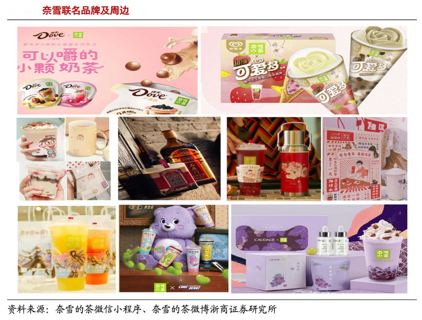 經(jīng)典案例:根據(jù)奈雪的茶微信小程序、奈雪的茶微博、浙商證券研究所等綜合資訊表明,奈雪已與人民日報、王者榮耀、杯子美術(shù)館、亞朵、 旺旺等 30 家多行業(yè)多品牌進行聯(lián)名。例如 2019 年 9 月,奈雪的茶聯(lián)名人民日報新媒體開 展“有為青年看包喝茶”活動,開設(shè)線下快閃店還原“爺爺喝的茶”、“爸爸喝的茶”、“我 喝的茶”三個不同年代的喝茶場景。