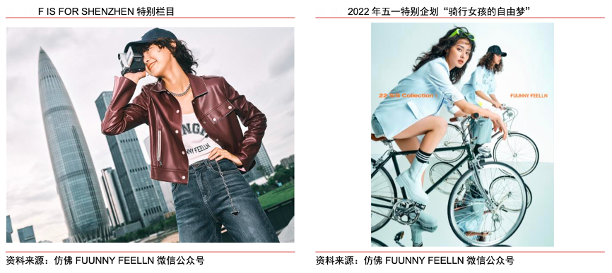 經(jīng)典案例:根據(jù)FUUNNY FEELLN微信公眾號(hào)、中信證券研究部等綜合資訊表明,F(xiàn)UUNNY FEELLN仿佛:融入深圳地域標(biāo)志,打造都市通勤標(biāo)簽,塑造酷颯女孩風(fēng)格。仿佛定位為中淑人群,聚焦未來(lái)女性的生活方式,主張把“新鮮的,趣味的設(shè)計(jì)元素”融入日常通勤時(shí)裝。2022 年推出 F IS FOR SHENZHEN 特別欄目,探尋深圳城市文化、仿佛品牌以及當(dāng)代酷颯女孩的共鳴與連接,傳遞“獨(dú)立、現(xiàn)代、自由、夢(mèng)想”的品牌精神。