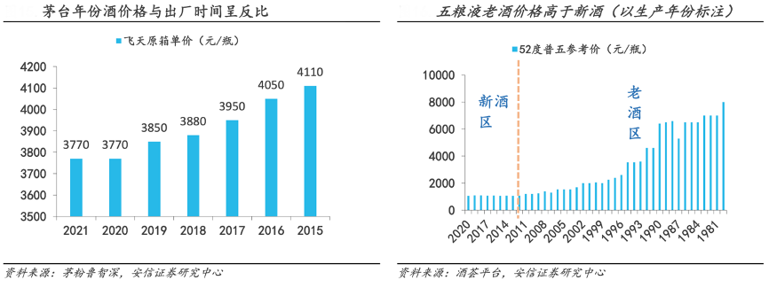 經(jīng)典案例:根據(jù)茅粉魯智深、酒薈平臺(tái)、安信證券研究中心等綜合資訊表明,活躍的老酒二級(jí)市場(chǎng)為高端白酒帶來(lái)了獨(dú)特的投資收藏屬性,茅臺(tái)和五糧液的年份酒均表現(xiàn)出年份越久、價(jià)格越高的特性。除市場(chǎng)因素外,高端白酒投資屬性還源于諸多要素,如高端白酒供給十分稀缺,茅臺(tái)酒短期內(nèi)供給幾乎無(wú)提升,五糧液老窖產(chǎn)能擴(kuò)張有限,同時(shí)還有控量保價(jià)需求,因此未來(lái)高端白酒供 給稀缺的格局難以改變。