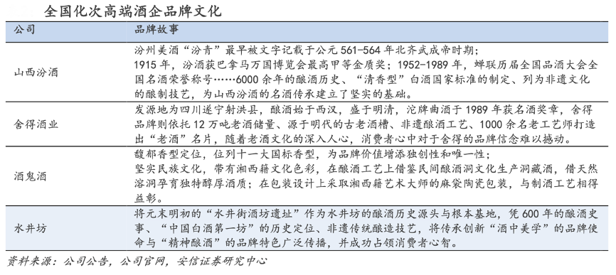 經(jīng)典案例:根據(jù)公司公告、公司官網(wǎng)、安信證券研究中心等綜合資訊表明,擁有 6000 余年釀酒歷史的清香型酒龍頭山西汾酒、具有老酒品質(zhì)并成功打造老酒文化的舍得、帶有湘西洞藏特色并獨(dú)創(chuàng)馥郁香型的酒鬼酒、憑借“中國(guó)白酒第一坊”的歷史地位傳承酒中美學(xué)的水井坊,均創(chuàng)造了其獨(dú)一無(wú)二的品牌故事,具備打造品牌文化的土壤。
