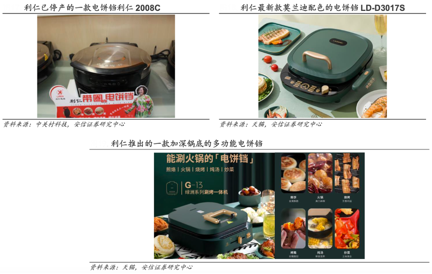 經(jīng)典案例:根據(jù)中關(guān)村科技、天貓、安信證券研究中心等綜合資訊表明,電餅鐺早期主要定位于做餅的工具,利仁產(chǎn)品開始朝多功能的方向發(fā)展,制作的食物種類也開始多樣化。除了功能上的改進(jìn),電餅鐺的外觀設(shè)計(jì)上也逐漸趨向年輕化,部分產(chǎn)品顏色為更年輕時(shí)尚的莫蘭迪配色,和吸引年輕女性的萌系配色。