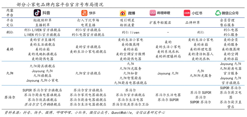 經(jīng)典案例:根據(jù)抖音、快手、微博、嗶哩嗶哩、小紅書、微信公眾號、QuestMobile、安信證券研究中心等綜合資訊表明,家電品牌已入駐多個(gè)內(nèi)容平臺,開展品牌運(yùn)營和流量競爭。除了抖音以外,品牌在其它內(nèi)容平臺也已建立了官方賬號,用以對不同類別的潛在客戶進(jìn)行品牌推廣及售后服務(wù)等。為了進(jìn) 一步提升品牌平臺流量,家電品牌也往往會和各類 KOL(關(guān)鍵意見領(lǐng)袖)進(jìn)行合作,一般以直播帶貨(銷售分成)及明星代言(代言費(fèi))居多。