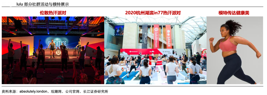 經(jīng)典案例:根據(jù)absolutely.london、觀潮網(wǎng)、公司官網(wǎng)、長江證券研究所等綜合資訊表明,lululemon不定期舉辦社群活動,包含店內(nèi)和店外兩種形式,此外還自 2011 年起持續(xù)贊助溫哥華每年舉辦的 SeaWheeze 半程馬拉松比賽。線下舉辦開放式瑜伽課程、熱汗派對等熱汗活動,線上開設(shè)免費體驗與付費課程,在活動中傳達品牌理念,持續(xù)進行消費者培養(yǎng)。