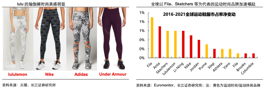 經(jīng)典案例:根據(jù)天貓、Euromonitor、長江證券研究所等綜合資訊表明,自 2015 年 以來 Athleisure 風(fēng)格大火,Google 搜索指數(shù)持續(xù)走高,以 Fila、Sketchers 等為代表的運動時尚品牌加速獲取市場份額。lululemon 作為高端瑜伽服裝品牌及 Athleisure 風(fēng)格 的締造者和引領(lǐng)者,以其強大的產(chǎn)品力和品牌力,占領(lǐng)消費者心智。2018 年開始不定期與品牌大使和設(shè)計師聯(lián)名推出產(chǎn)品,進一步增強產(chǎn)品時尚性和品牌影響力。