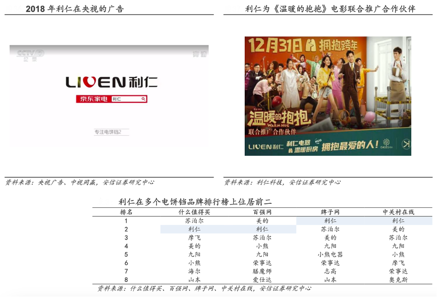 經(jīng)典案例:根據(jù)央視廣告、中視同贏、利仁科技、什么值得買、百強網(wǎng)、牌子網(wǎng)、中關(guān)村在線、安信證券研究中心等綜合資訊表明,利仁公司重視品牌打造,電餅鐺細分品類品牌優(yōu)勢顯著。公司曾在央視播出廣告,并贊助播出了當時全國熱播的《舌尖上的中國 3》,提升了公司電餅鐺產(chǎn)品在全國的知名度。通過長時間品牌形象和消費者口碑的積累,公司在多個電餅鐺的品牌排行榜排名前二,體現(xiàn)了公司品牌在電餅鐺品類上的領(lǐng)先優(yōu)勢。