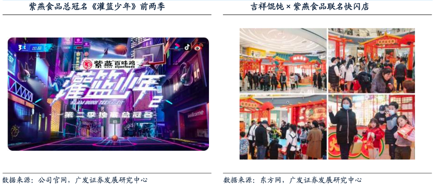經(jīng)典案例:根據(jù)公司官網(wǎng)、東方網(wǎng)、廣發(fā)證券發(fā)展研究中心等綜合資訊表明,線上方面,近年來紫燕食品公司通過冠名綜藝節(jié)目《灌籃少年》、參與支付寶“集五福”等活動,擴大品牌影響力;;線下方面,2018-2021年公司連續(xù)四年舉辦“917鹵味節(jié)”,探索鹵味文化傳播新方式;跨界聯(lián)名方面,公司通過與吉祥餛飩開辦聯(lián)名快閃店、與電影《八佰》聯(lián)合推 廣。