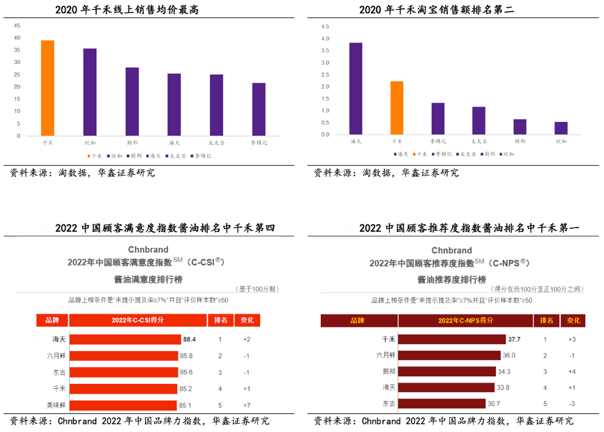 經(jīng)典案例:根據(jù)淘數(shù)據(jù)、Chnbrand 2022年中國品牌力指數(shù)、華鑫證券研究等綜合資訊表明,千禾公司零添加的產(chǎn)品形象深入人心,在消費(fèi)者中提到零添加基本上就會聯(lián)想至千禾。根據(jù) Chnbrand 2022 年中國品牌力指數(shù),千禾的品牌聯(lián)想指數(shù)排名第二,在醬油推薦度和滿意度榜單中分列 1、4 名,在食醋推薦度榜單中名列第三。根據(jù)淘數(shù)據(jù),2020 年 千禾在淘寶銷售中,均價最高,銷售額仍高居第二,占淘寶調(diào)味品總銷售額的 12%。千禾中高端的零添加品牌形象基本形成,品牌影響力持續(xù)增強(qiáng)。