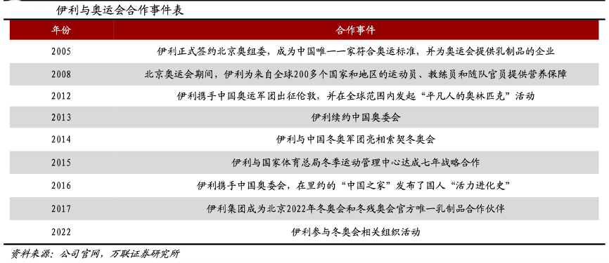 經典案例:根據(jù)公司官網(wǎng)、萬聯(lián)證券研究所等綜合資訊表明,以龍頭伊利股份為例,從2005年與北京奧組委簽約開始,伊利逐漸成為奧運會、殘奧會等運動賽事的忠實合作伙伴。