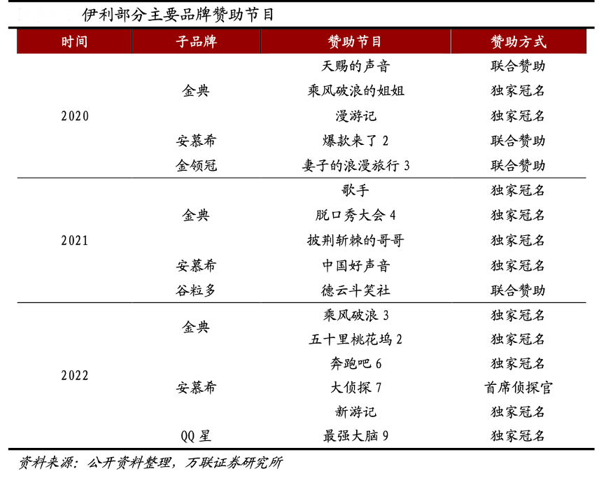 經典案例:根據(jù)公司資料、萬聯(lián)證券研究所等綜合資訊表明,伊利獨家冠名10家節(jié)目以上,奔跑吧兄弟、中國好聲音等一系列綜藝節(jié)目的火爆為伊利品牌的推廣起到了巨大的推進作用。通過賽事、綜藝等品牌宣傳活動,品牌商進一步提升了品牌形象與知名度,培育終端消費者心智,助力品牌傳播。
