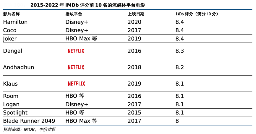 經(jīng)典案例:根據(jù)IMDB、中信建投等綜合資訊表明,電影專業(yè)評(píng)分平臺(tái) IMDb 數(shù)據(jù)顯示:2015至2022年間評(píng)分位居前十的流媒體電影中,Netflix 擁有其中 3 部影片的獨(dú)家播放權(quán),成為擁有最多上榜影片的流媒體平臺(tái)之一。專業(yè)獎(jiǎng)項(xiàng)上,Netflix 在艾美獎(jiǎng)評(píng)選中斬獲的提名和獎(jiǎng)項(xiàng)數(shù)量整體呈現(xiàn)增長(zhǎng)趨勢(shì);在 2022 年學(xué)院獎(jiǎng)評(píng)選中,Netflix 在與眾多傳統(tǒng)電影制作商和新興流媒體平臺(tái)的競(jìng)爭(zhēng)中斬獲了最多獎(jiǎng)項(xiàng)。