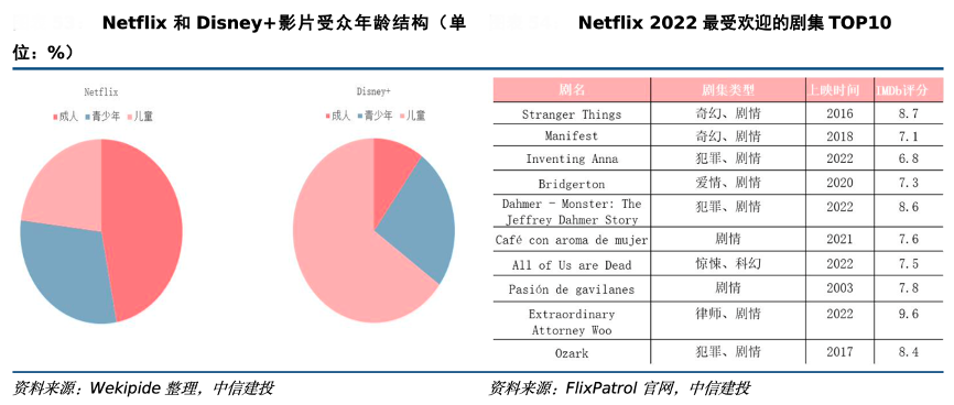 經(jīng)典案例:根據(jù)Wekipide、FlixPatrol官網(wǎng)、中信建投等綜合資訊表明,結(jié)合FlixPatrol 網(wǎng)站根據(jù)收視率等指標(biāo)統(tǒng)計(jì)的 2022 年最受歡迎的電視劇顯示,Netflix 主要?jiǎng)〖膬?nèi)容類型為奇幻、犯罪、劇情,受眾偏向于成年人,而Disney+多數(shù)為 動(dòng)畫和情景喜劇,HBO MAX 的內(nèi)容類型涵蓋面較廣,并沒有特定群體的客戶定位。